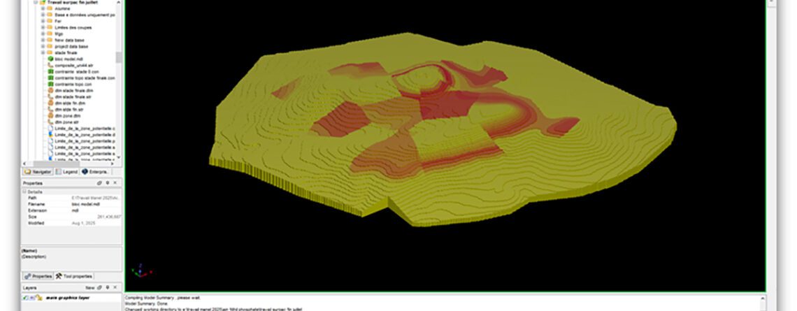 - Définition d’un schéma d’exploitation et d’aménagement, incluant la proposition de méthodes d’extraction adaptées, l’élaboration de plans directeurs conformes aux exigences environnementales, ainsi que la production de Modèles Numériques de Terrain (MNT) illustrant les différentes phases d’exploitation ;